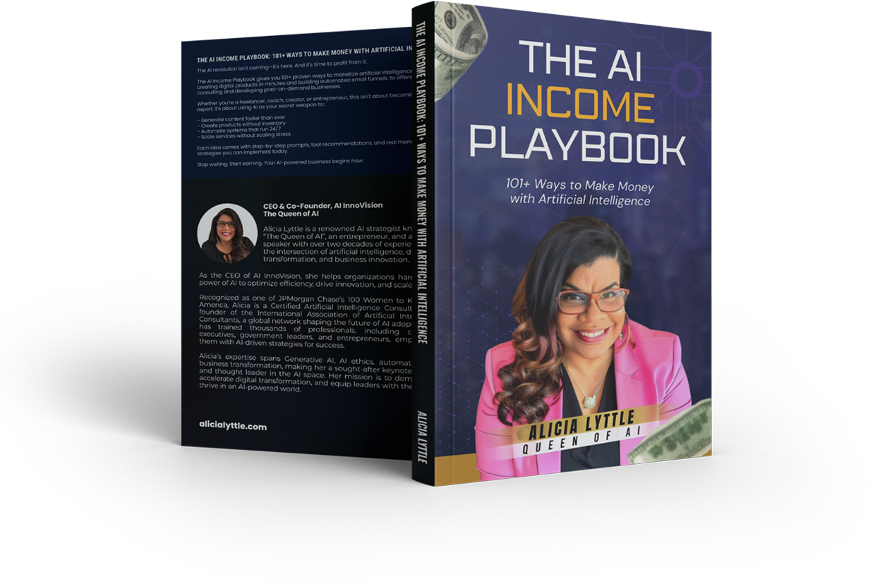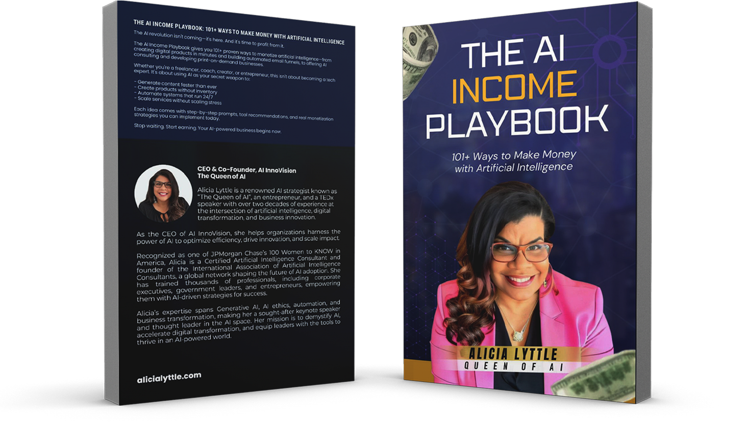 This isn’t just another book — it’s your roadmap to building real income with artificial intelligence. Inside The AI Income Playbook, Alicia Lyttle (“The Queen of AI”) reveals 101+ proven ways to make money with AI, from freelancing and digital products to consulting, e-commerce, and automation systems.